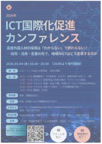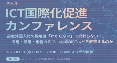 本カンファレンスは、ICT業界における高度外国人材の採用・活用・定着をテーマに、外国人材を採用している企業の事例や、宮城県・仙台で働く外国人のリアルな声、行政の支援制度などを共有しながら、参加者同士が気軽に意見交換・交流できるイベントです。